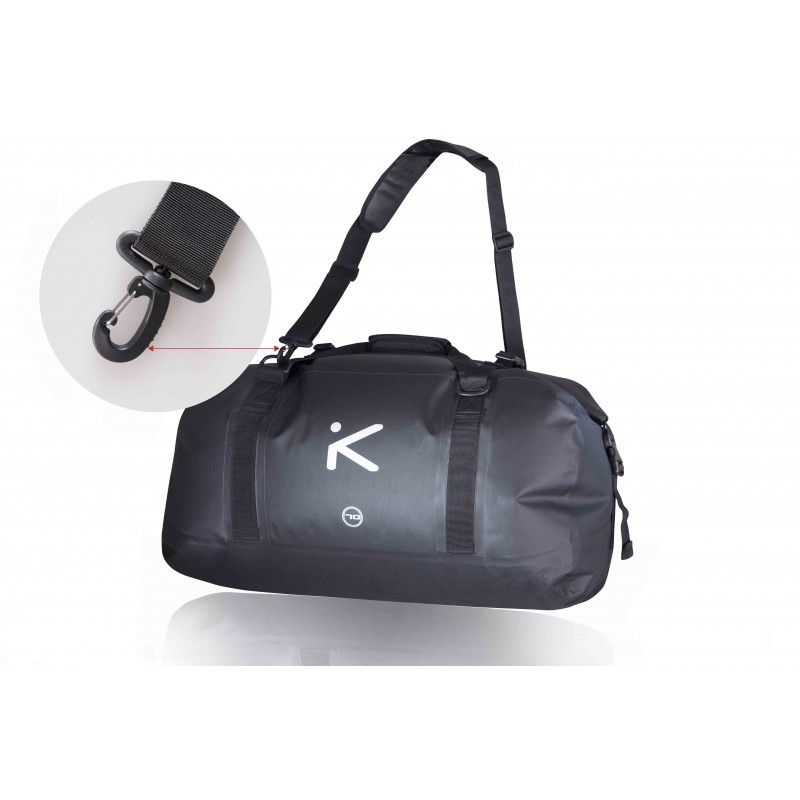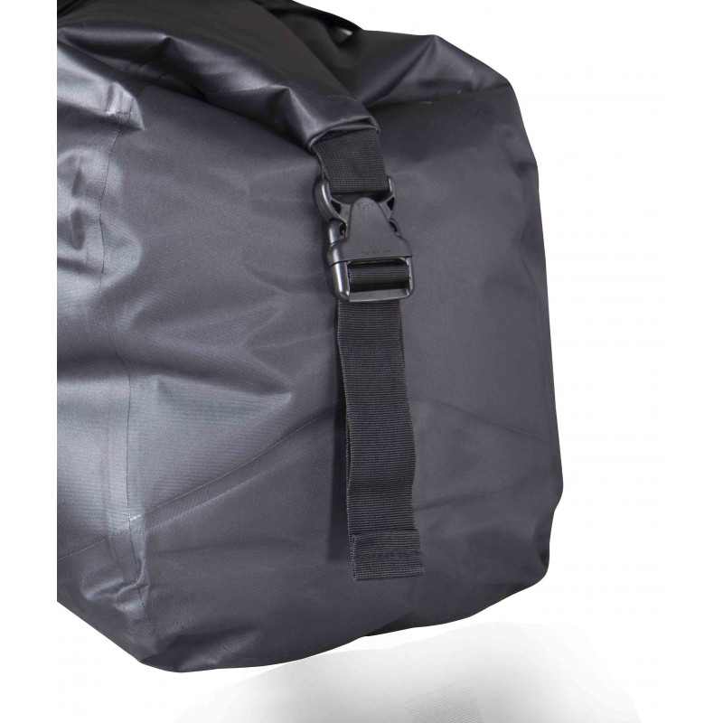 Waterproof duffle bag with a wide roll top closure.